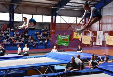 Con ayuda de un trampolín, se realizan saltos o movimientos acrobáticos en el aire.